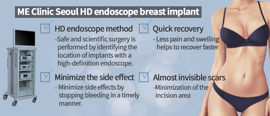 - Infra-mammary incision - most basic approach method with minimum scar of 2~3 cm long. Low pain